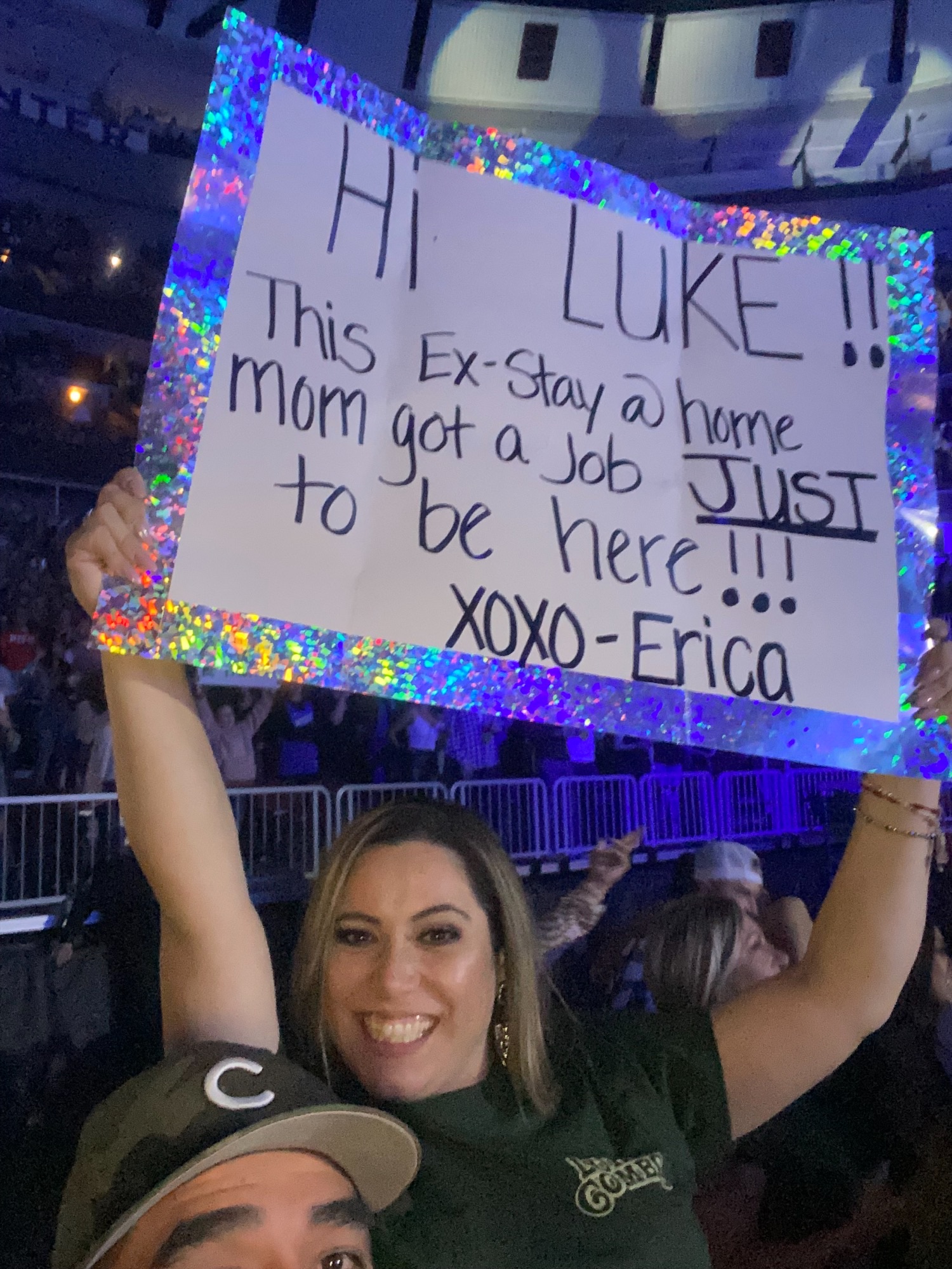 Erica did get those Luke Combs tickets. The venue even put her poster on the Jumbotron that said: "This ex-stay at home mom got a job just to be here!”